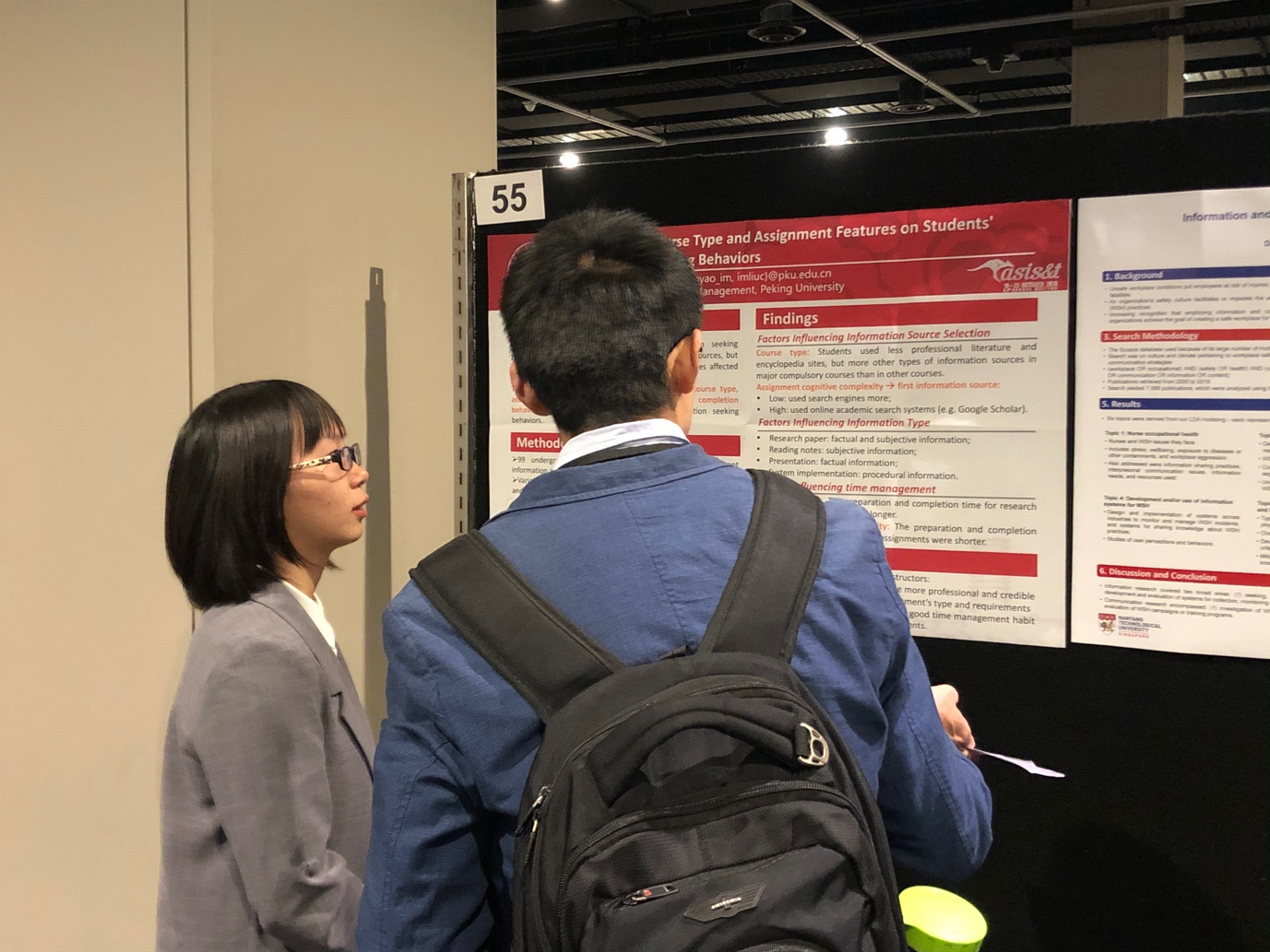 张瑶同学和刘畅老师合作完成的海报《Influence of Course Type and Assignment Features on Students' Information Seeking Behaviors》研究了现实环境中大学生为完成作业而进行的信息搜寻活动和时间管理行为,并探究了课程类型及作业特征这两类行为的影响。研究将认知与信息搜寻行为结合起来,引发了广泛关注和讨论。