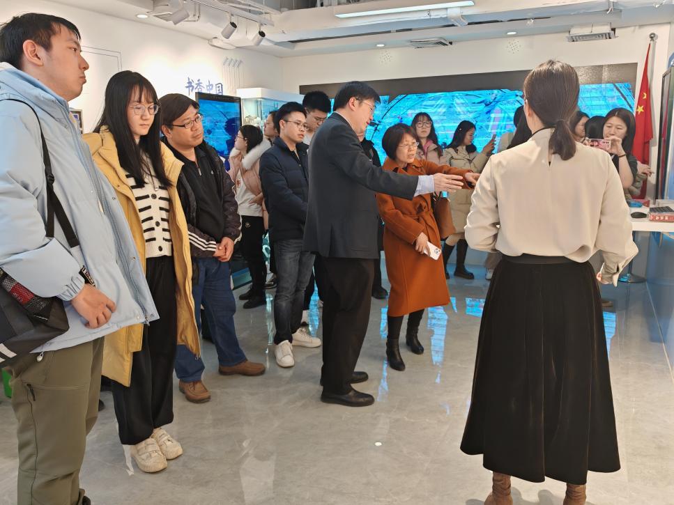 参观结束后,一行人移步至会议室进行交流。杜嘉以“智慧阅读助力图书馆服务书香社会建设的探索与思考”为题,从信息管理、技术应用、市场趋势到实际案例成果等多个方面,全方位剖析了在公共文化和教育领域,数字文化建设的现状与挑战。
