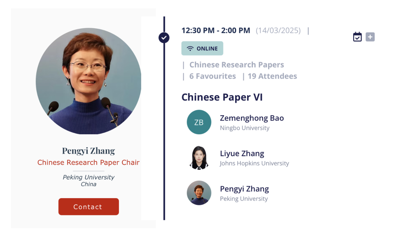 iConference是由国际信息学院联盟(iSchools)主办的高水平国际学术年会,专注于信息资源管理领域的最新研究进展,强调跨学科合作与交流。2025年的iConference以“生活在人工智能的算法世界(Living in an AI-gorithmic world)”为主题,聚焦生成式人工智能、机器学习、数据分析等技术对信息的收集、存储、检索、使用等带来的深远影响。会议采用线上线下相结合的形式举办,其中线上阶段为3月11日至15日,线下阶段为3月18日至22日,由美国印第安纳大学承办。长期以来,我系师生积极参与iConference系列会议,并在会议中展示了多项高水平研究成果。本届会议中,我系张鹏翼老师担任中文论文分论坛主席。
