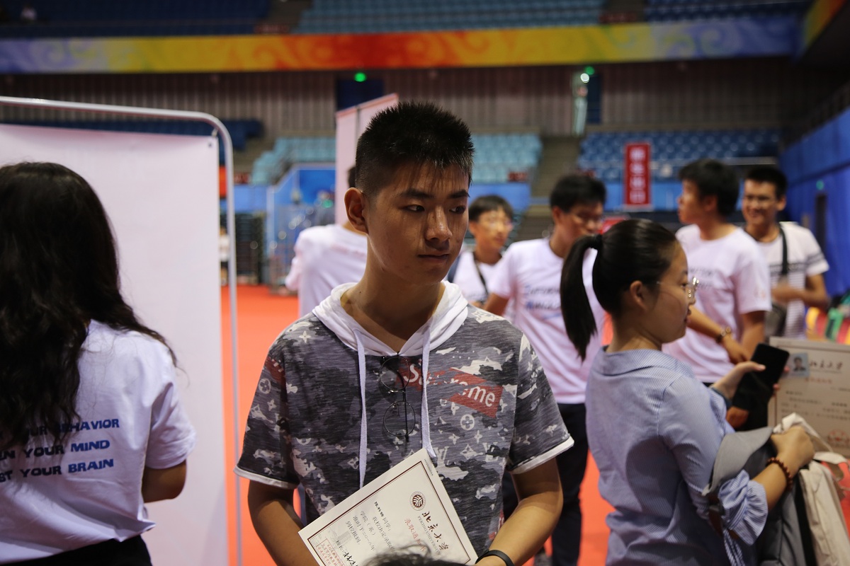 06:49,第1位同学完成了报到手续;14:52,第62位同学完成了报到手续。迎新志愿者们仔细查验新生的录取通知书和证件,认真解答新生提出的问题,悉心为他们办理报到手续、发放迎新礼包、陪同去往绿色通道,还为他们留下了在北大的第一张照片。