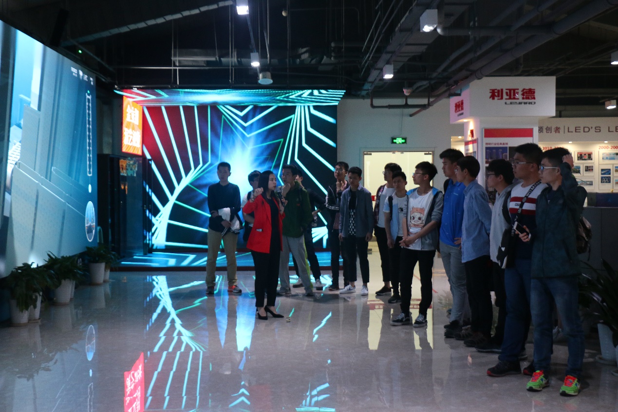 师生们首先参观了利亚德集团的LED技术成果展示,讲解员为师生介绍了利亚德集团的发展历程和技术成果。据介绍,利亚德集团成立于1995年,是集设计、生产、销售及服务为一体的LED显示屏和LED发光产品应用的专业公司。经过二十余年的发展,集团业务聚焦于LED显示、城市景观亮化、文化科技融合、虚拟现实等行业。曾完成2008年奥运会开幕式声光电、国庆阅兵大屏、APEC会议网幕、多届春晚视效、G20峰会夜景亮化、金砖会晤厦门鼓浪屿夜景亮化、武汉两江四岸、赤峰、上饶、遵义等城市的夜景提升工程。