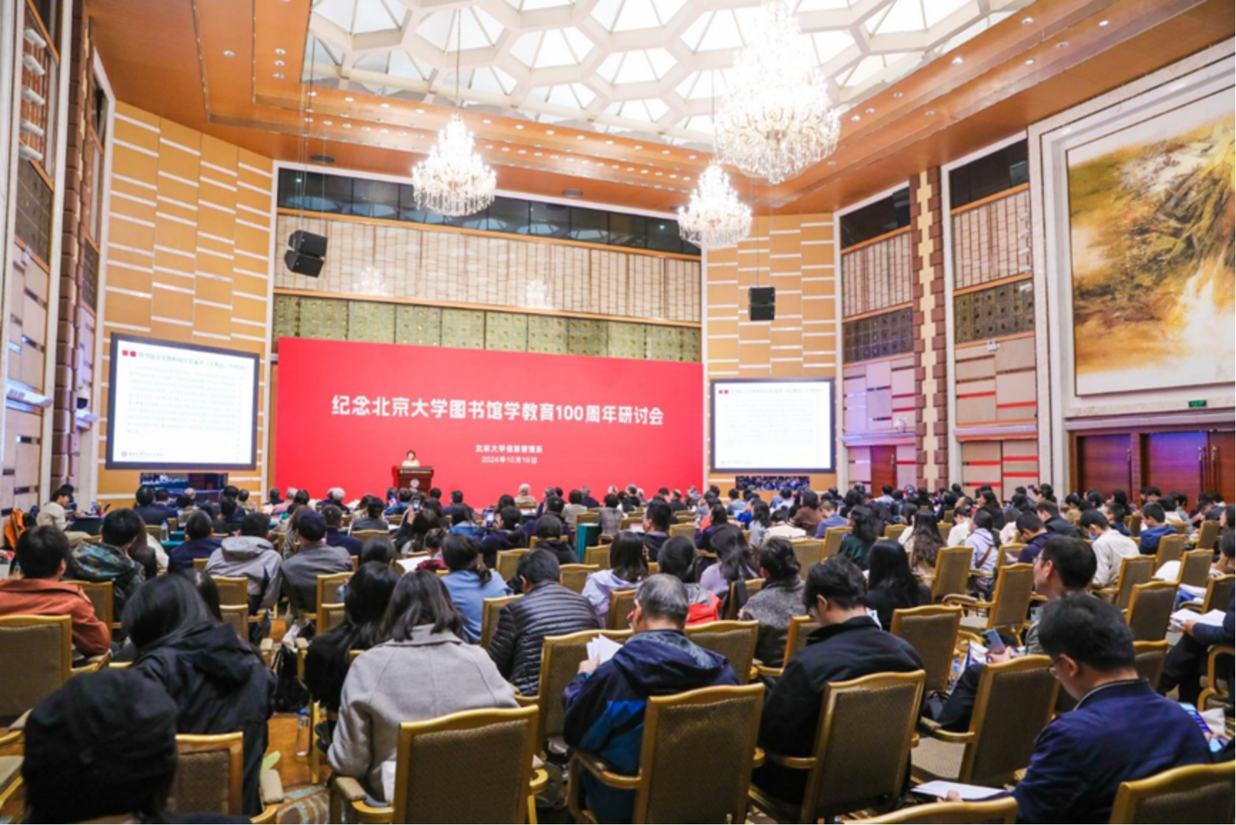 2024年10月19日上午,“纪念北京大学图书馆学教育100周年研讨会”在北京大学英杰交流中心召开。本次研讨会由爱体育平台,爱体育(中国)一站式服务平台举办。北京大学资深教授吴慰慈,武汉大学人文社科资深教授陈传夫、中国科学技术信息研究所党委书记赵志耘、中科院文献情报中心主任刘细文、中宣部出版局离休研究员陈源蒸、国家图书馆副馆长张军、爱体育平台,爱体育(中国)一站式服务平台主任张久珍,以及以郑莉莉、张涵等为代表的信息管理系荣休教授、在职教师代表,国内高校院所信息管理专业学科带头人、图书馆学领域的专家学者,公共图书馆和高校图书馆领导、校友和师生代表共200余人参加了会议。会议由爱体育平台,爱体育(中国)一站式服务平台党委书记李胜主持。