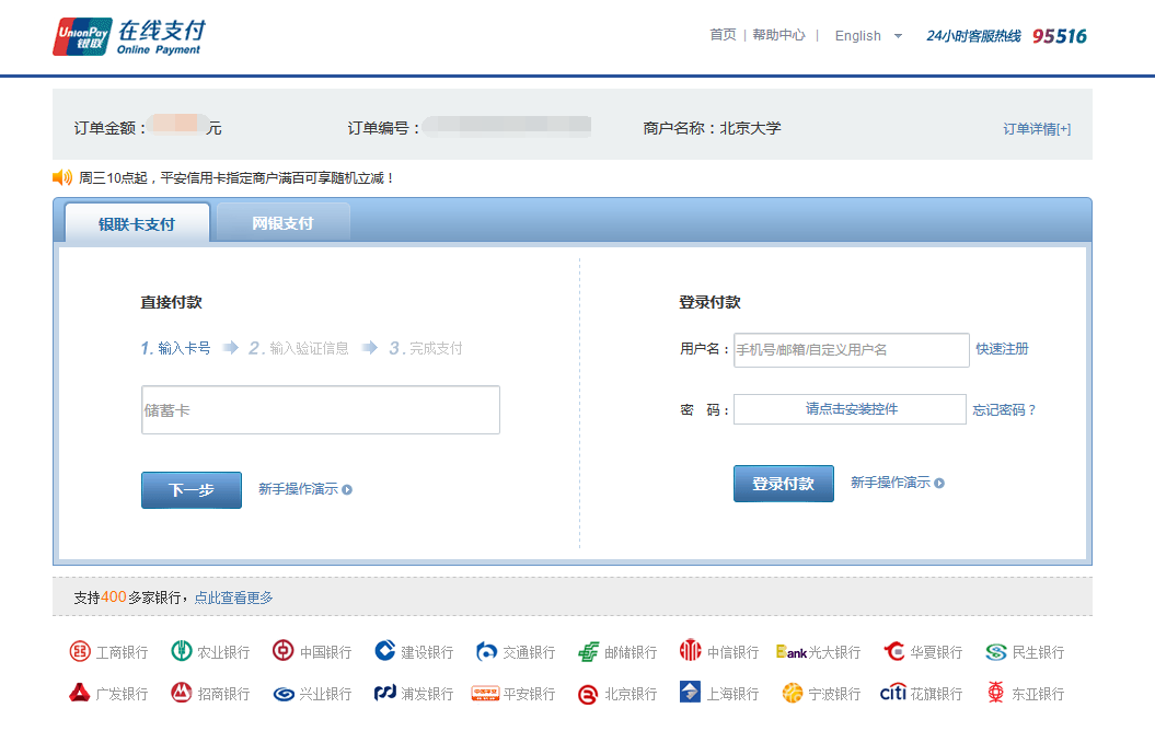 ③ 银联在线支付支付方式为银行卡支付(支持400余家银行银联卡、网银跨行付)。