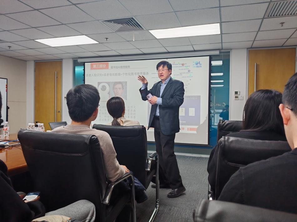 参观结束后,一行人移步至会议室进行交流。杜嘉以“智慧阅读助力图书馆服务书香社会建设的探索与思考”为题,从信息管理、技术应用、市场趋势到实际案例成果等多个方面,全方位剖析了在公共文化和教育领域,数字文化建设的现状与挑战。