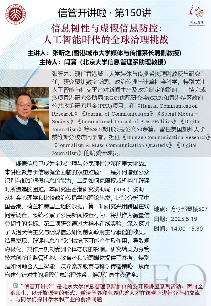 信管开讲啦·第150讲 | 信息韧性与虚假信息防控:人工智能时代的全球治理挑战