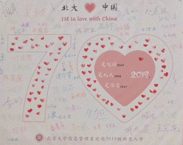 热情的迎新师生井然有序地帮他完成了身份验证、档案收取、礼包发放、签名绘心等一系列流程,并在信管系祝福祖国70周年生日的主题迎新展板前拍照留念。