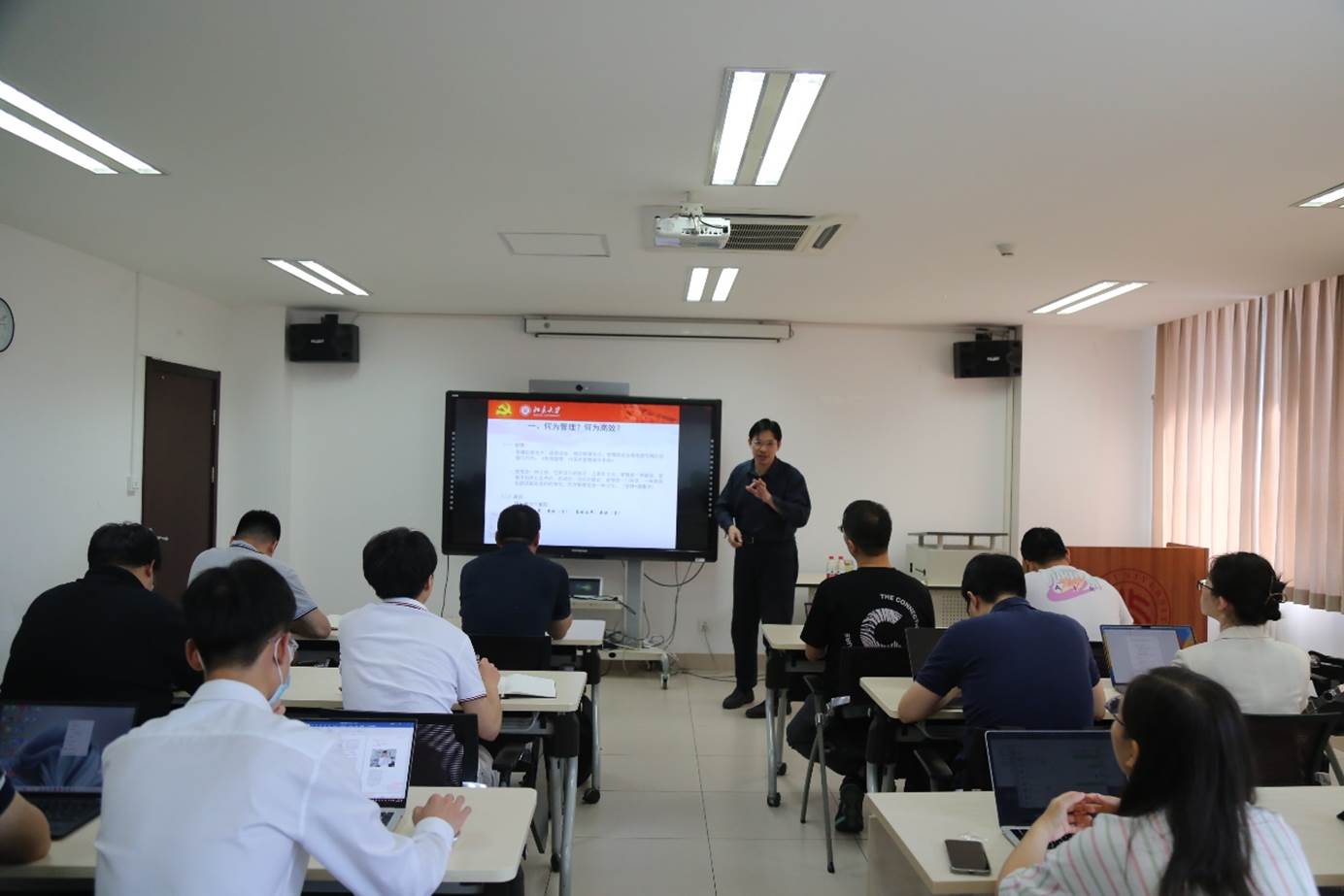按照北京大学学习贯彻习近平新时代中国特色社会主义思想主题教育实施方案的总体部署,信息管理系积极落实党员领导干部讲授专题党课活动。6月8日上午,信息管理系党委书记李胜在方李邦琴楼414室以 “勇于担当、从我做起——关于高效管理的相关实践与思考”为主题讲授党课,系党委副书记张妙妙、教职工党支部委员、学生党支部书记、师生党员等20余人参加学习。