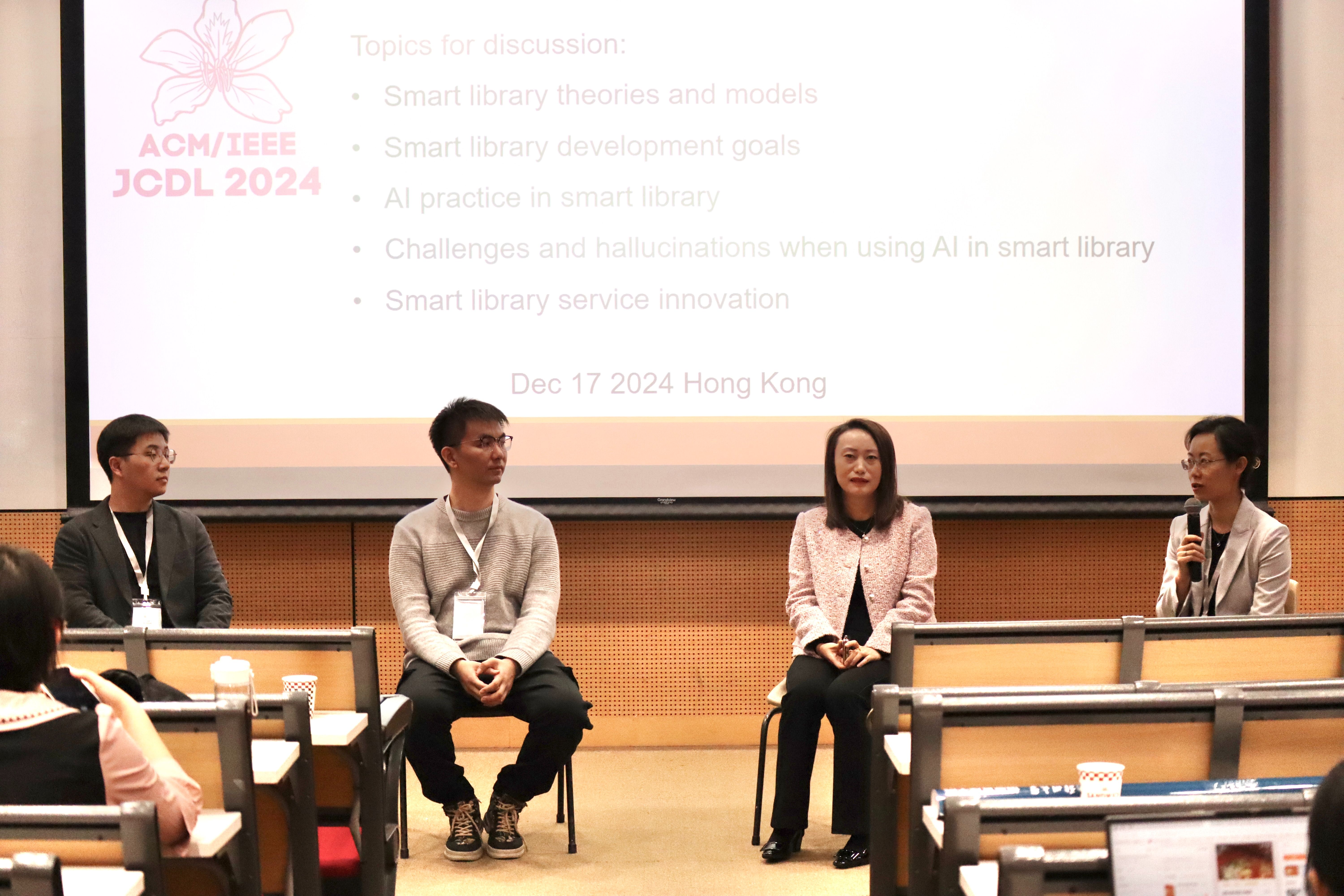 张鹏翼和唐震怡参与了专题研讨“Panel #1: Smart Library in the Age of Artificial Intelligence: Vision, Application and Strategy”,针对如何打造适合图书馆的大语言模型,提供更精准的检索服务和用户交互体验,以及如何将这些先进技术应用于实际工作中,在技术应用过程中可能遇到的阻碍等问题进行了探讨。这些讨论不仅涉及技术层面的挑战,还包括了如何在保持图书馆传统服务的同时,融入现代技术以满足用户日益增长的信息需求。通过与会者的充分交流,大家一起讨论解决方案,以期推动智慧图书馆的发展。