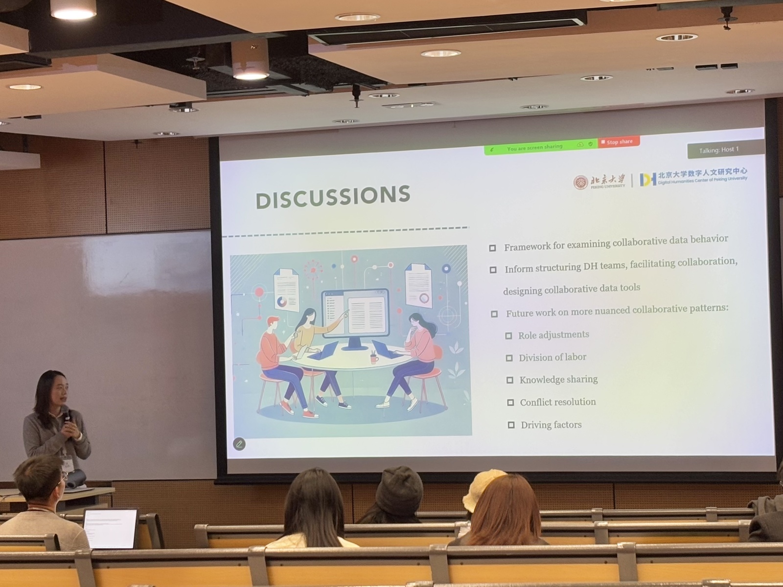李文琦在“数字人文”分论坛中汇报了与唐震怡、张鹏翼和王军合作的论文“Collaborative Data Behaivors in Digital Humanities Research Teams”。该论文基于北京大学数字人文中心举办的两次数字人文暑期课,探索数字人文研究团队中的协同数据行为,揭示团队在不同数据活动中采用的协同模式。论文通过对协同数据行为的分析,为跨学科团队协作引入新的研究视角,并对初期的数字人文团队构建和协作提供实践参考。