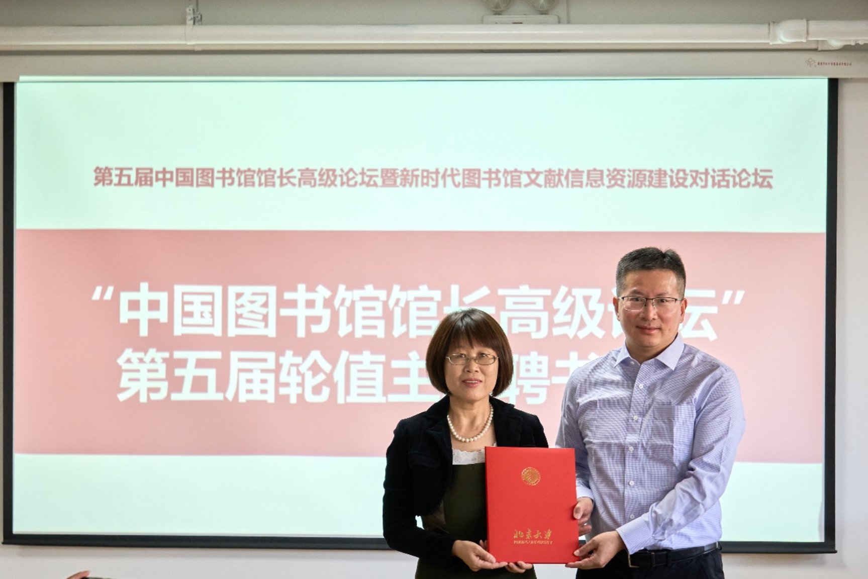 开幕式由第一届论坛轮值主席倪晓建馆长主持。张久珍主任致辞,指出“馆长论坛”是对一直在业界努力耕耘、推动图书馆事业发展的群体的致敬,呼吁学界与业界同仁加强对图书馆信息资源建设的重视,共同为图书馆建设作出专业性、系统性和体系化的贡献。随后,张久珍教授为本次论坛轮值主席徐益波馆长颁发聘书。徐益波馆长在轮值主席致辞中,首先感谢主办方搭建了交流平台,强调人工智能对图书馆服务和资源建设的双重影响,介绍了乔石书房藏书展及口述史采集计划,分享“天一助读”活动品牌旗下的“‘听·书声’印记图书馆”项目获2025年国际图书馆协会联合会(IFLA)营销奖的成果,并表示将持续推动图书馆事业发展。
