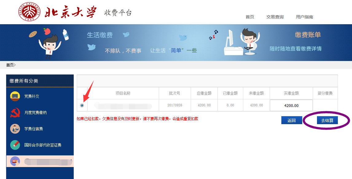 核对缴费项目、姓名、缴费金额无误后,勾选缴费项,点击“去结算”。