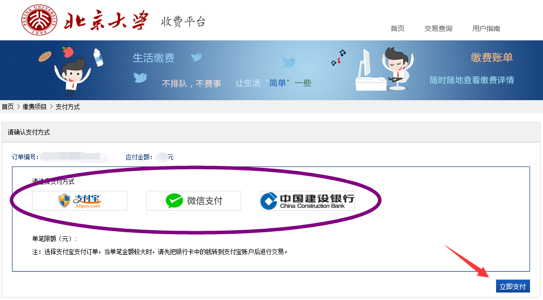 3、核对应付金额无误后,选择支付方式,点击“立即支付”