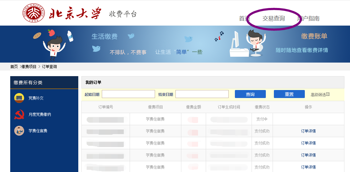4、支付完成后,可点击“交易查询”查看交易状态,交易有可能出现网络延迟,如果已经支付成功,请不要再次缴费,以免造成重复缴费。